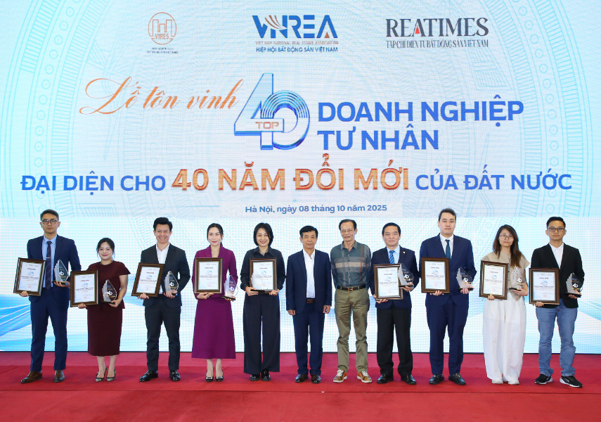 Sáng ngày 8/10/2025, tại Hà Nội, trong khuôn khổ Hội thảo “Xây dựng và phát huy sức mạnh của đội ngũ doanh nghiệp dân tộc vì khát vọng Việt Nam thịnh vượng”, Tạp chí điện tử Bất động sản Việt Nam đã trang trọng tổ chức Lễ tôn vinh 40 doanh nghiệp tư nhân tiêu biểu, đại diện cho 40 năm Đổi mới của đất nước.