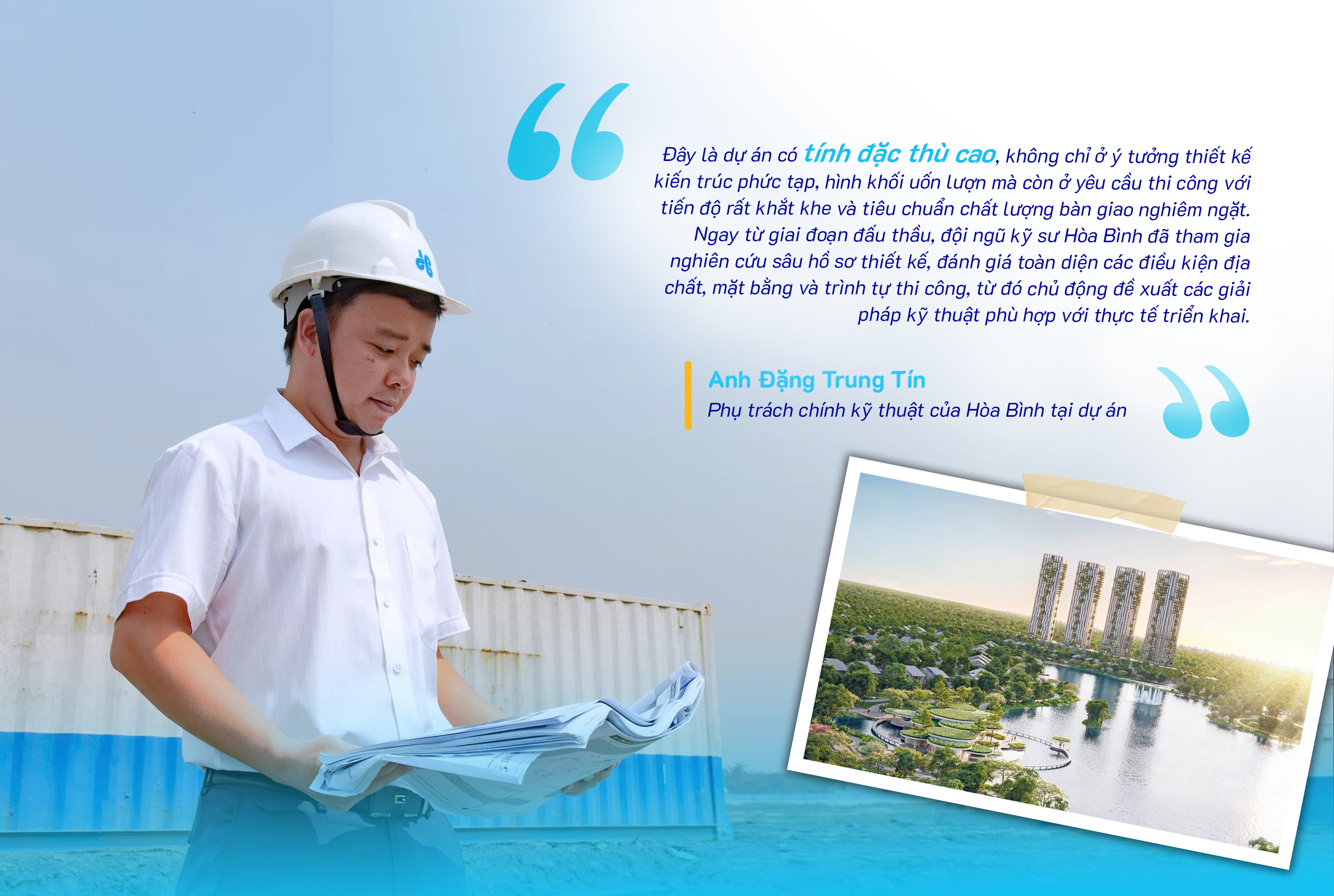 Anh Đặng Trung Tín – Phụ trách chính kỹ thuật của Hòa Bình tại dự án nhấn mạnh: “Đây là dự án có tính đặc thù cao, không chỉ ở ý tưởng thiết kế kiến trúc phức tạp, hình khối uốn lượn mà còn ở yêu cầu thi công với tiến độ rất khắt khe và tiêu chuẩn chất lượng bàn giao nghiêm ngặt. Ngay từ giai đoạn đấu thầu, đội ngũ kỹ sư Hòa Bình đã tham gia nghiên cứu sâu hồ sơ thiết kế, đánh giá toàn diện các điều kiện địa chất, mặt bằng và trình tự thi công, từ đó chủ động đề xuất các giải pháp kỹ thuật phù hợp với thực tế triển khai.”