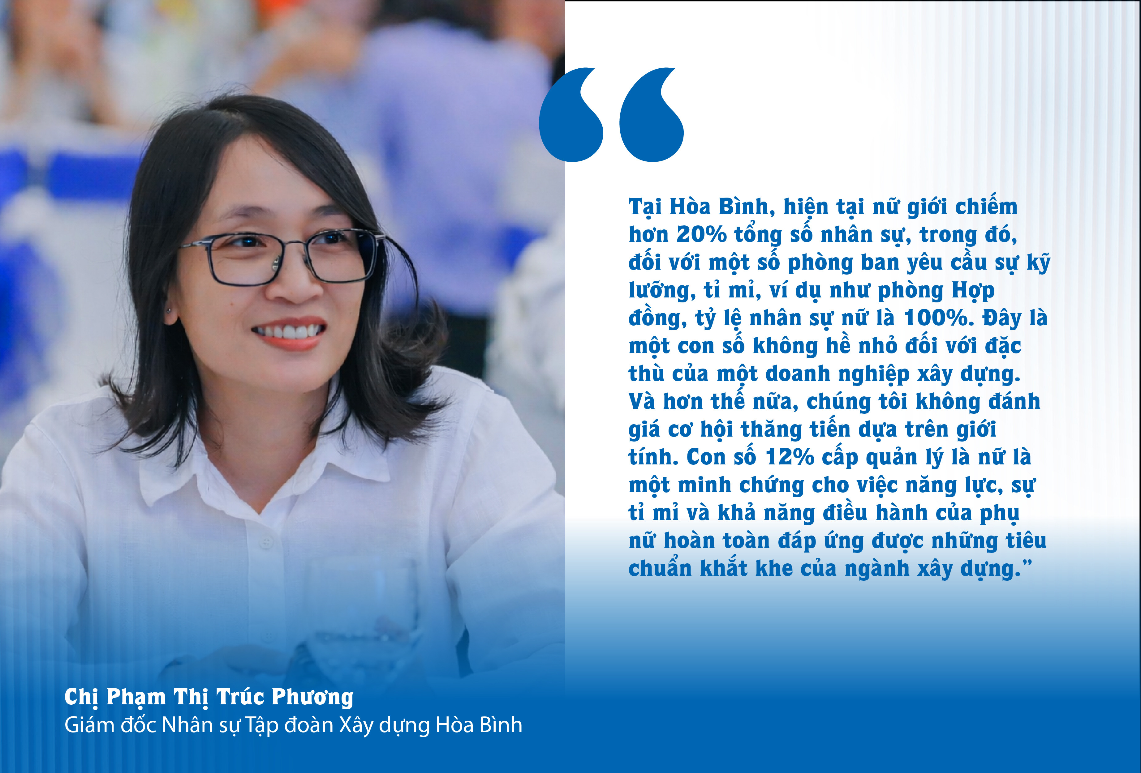 Minh chứng cho sự chuyển mình mạnh mẽ này, Chị Phạm Thị Trúc Phương, Giám đốc Nhân sự Tập đoàn Xây dựng Hòa Bình, cho biết: “Tại Hòa Bình, hiện tại nữ giới chiếm hơn 20% tổng số nhân sự, trong đó, đối với một số phòng ban yêu cầu sự kỹ lưỡng, tỉ mỉ, ví dụ như phòng Hợp đồng, tỷ lệ nhân sự nữ là 100%. Đây là một con số không hề nhỏ đối với đặc thù của một doanh nghiệp xây dựng. Và hơn thế nữa, chúng tôi không đánh giá cơ hội thăng tiến dựa trên giới tính. Con số 12% cấp quản lý là nữ là một minh chứng cho việc năng lực, sự tỉ mỉ và khả năng điều hành của phụ nữ hoàn toàn đáp ứng được những tiêu chuẩn khắt khe của ngành xây dựng.”
