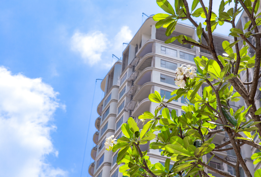 Màu “áo mới” không chỉ đến từ những mảng kính hiện đại lấp lánh dưới nắng, mà còn từ sự chỉn cho trong từng chi tiết mặt ngoài, từ những đường bo cong tinh tế của ban công đến sự kết hợp hài hòa với cảnh quan xanh mát xung quanh.